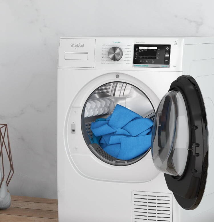 Supreme Silence torktumlaren säkerställer alltid jämn torkning och använder mindre el tack vare värmepumpsteknik. Specialsystemet fungerar med en sluten krets som gör det möjligt att återvinna den förvärmda luften vid behov, utan att kräva extra energi under cykeln.